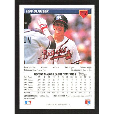 This is a 1993 Donruss Jeff Blauser baseball card. The card is #134 and pictures show condition.