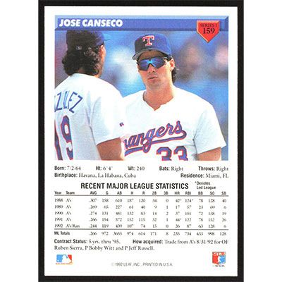 This is a 1993 Donruss Jose Canseco baseball card. The card is #159 and pictures show condition.