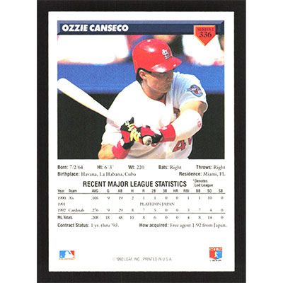 This is a 1993 Donruss Ozzie Canseco baseball card. The card is #336 and pictures show condition.