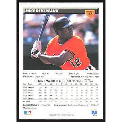 This is a 1993 Donruss Mike Devereaux autographed baseball card. This card has been signed, in blue, by Mike Devereaux, and is guaranteed authentic by Ballcardz.com. The card is #455 and pictures show condition.