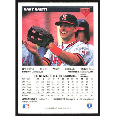 This is a 1993 Donruss Gary Gaetti baseball card. The card is #517 and pictures show condition.