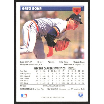 This is a 1993 Donruss Greg Gohr Rated Rookie baseball card. The card is #605 and pictures show condition.