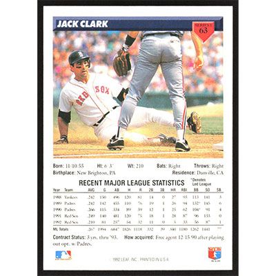 This is a 1993 Donruss Jack Clark baseball card. The card is #63 and pictures show condition.