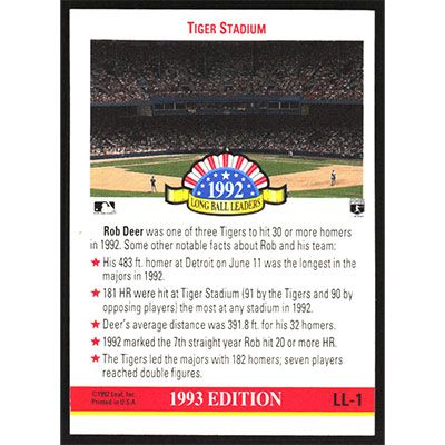 This is a 1993 Donruss Long Ball Leaders Rob Deer baseball card. The card is #LL-1 and pictures show condition.