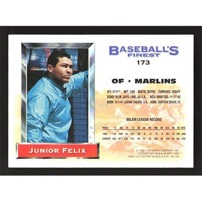This is a 1993 Finest Junior Felix baseball card. The card is #173 and pictures show condition.