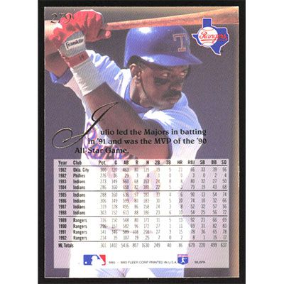 This is a 1993 Flair Julio Franco baseball card. The card is #279 and pictures show condition.