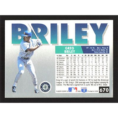 This is a 1993 Fleer Greg Briley baseball card. The card is #670 and pictures show condition.
