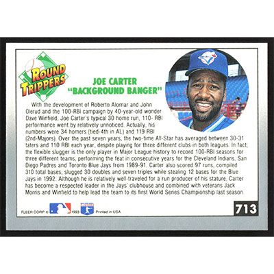 This is a 1993 Fleer Joe Carter Round Trippers baseball card. The card is #713 and pictures show condition.