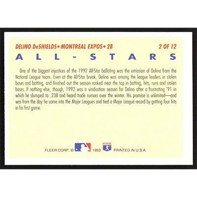 This is a 1993 Fleer All-Stars Delino DeShields baseball card. The card is #2 and pictures show condition.
