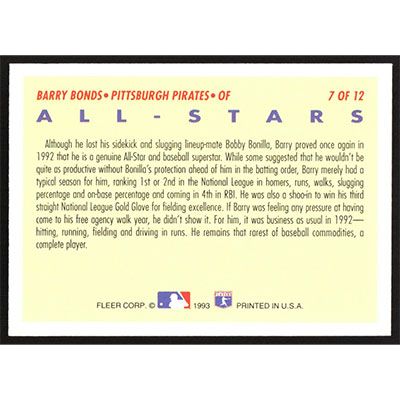 This is a 1993 Fleer All-Stars NL Barry Bonds baseball card. The card is #7 and pictures show condition.