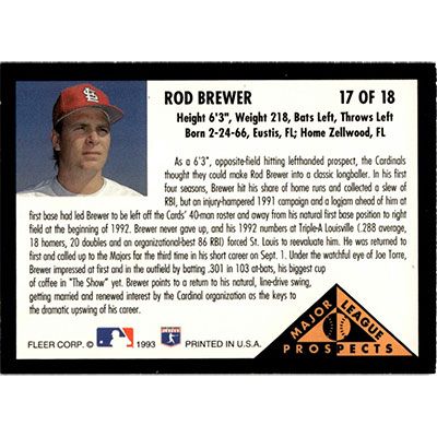 This is a 1993 Fleer Major League Prospects Rod Brewer baseball card. The card is #17 and pictures show condition.