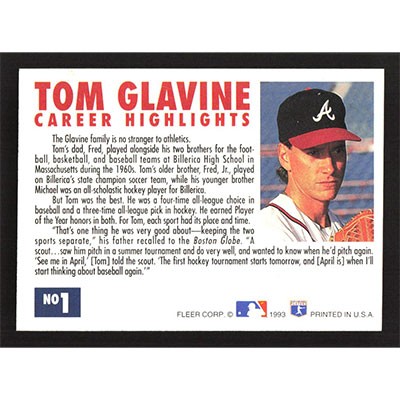 This is a 1993 Fleer Tom Glavine Career Highlights Tom Glavine Facing Right baseball card. The card is #1 and pictures show condition. Team(s): Atlanta Braves