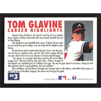 This is a 1993 Fleer Tom Glavine Career Highlights Tom Glavine Facing Right baseball card. The card is #3 and pictures show condition. Team(s): Atlanta Braves