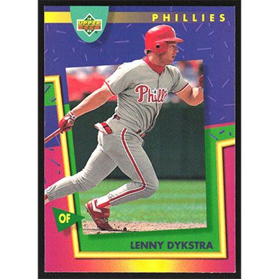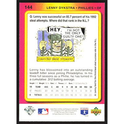This is a 1993 Fun Pack Lenny Dykstra baseball card. The card is #144 and pictures show condition.