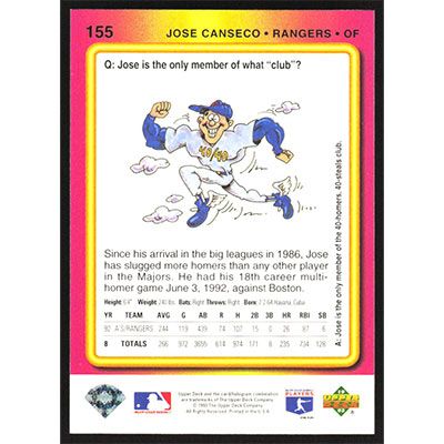 This is a 1993 Fun Pack Jose Canseco baseball card. The card is #155 and pictures show condition.