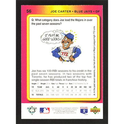 This is a 1993 Fun Pack Joe Carter baseball card. The card is #56 and pictures show condition.