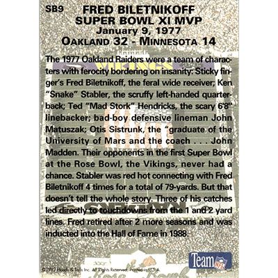 This is a 1993 Heads & Tails SB XXVII Fred Biletnikoff football card. The card is #SB9 and pictures show condition.
