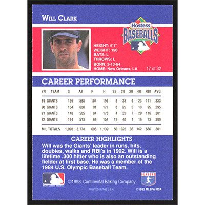 This is a 1993 Hostess Will Clark baseball card. The card is #17 and pictures show condition.