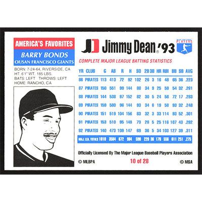 This is a 1993 Jimmy Dean Barry Bonds baseball card. The card is #10 and pictures show condition.