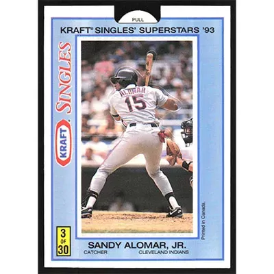 This is a 1993 Kraft Singles Superstars Sandy Alomar Jr. baseball card. The card is #3 and pictures show condition.