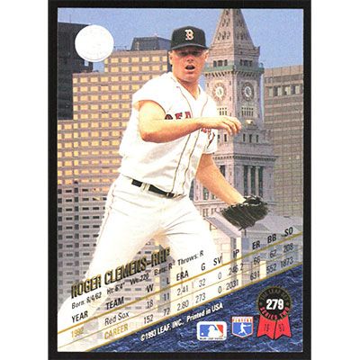 This is a 1993 Leaf Roger Clemens baseball card. The card is #279 and pictures show condition.