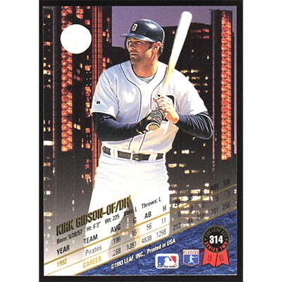 This is a 1993 Leaf Kirk Gibson baseball card. The card is #314 and pictures show condition.