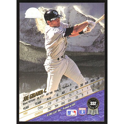 This is a 1993 Leaf Joe Girardi baseball card. The card is #332 and pictures show condition.