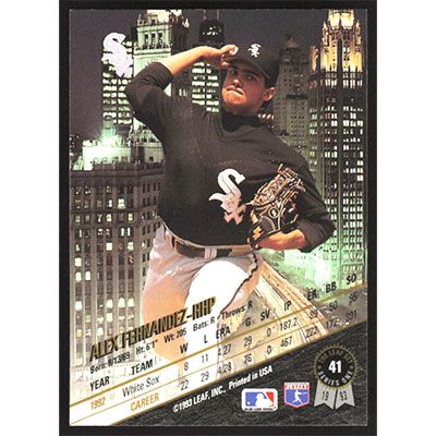 This is a 1993 Leaf Alex Fernandez baseball card. The card is #41 and pictures show condition.