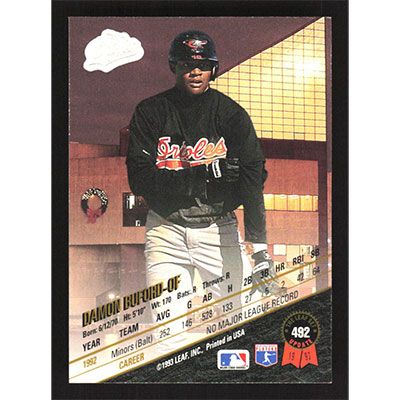 This is a 1993 Leaf Damon Buford baseball card. The card is #492 and pictures show condition.