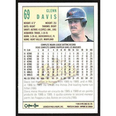 This is a 1993 O-Pee-Chee Glenn Davis baseball card. The card is #69 and pictures show condition.