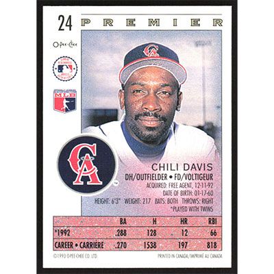 This is a 1993 O-Pee-Chee Premier Chili Davis baseball card. The card is #24 and pictures show condition.