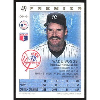 This is a 1993 O-Pee-Chee Premier Wade Boggs baseball card. The card is #49 and pictures show condition.