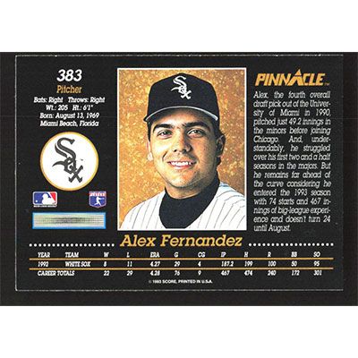 This is a 1993 Pinnacle Alex Fernandez baseball card. The card is #383 and pictures show condition.