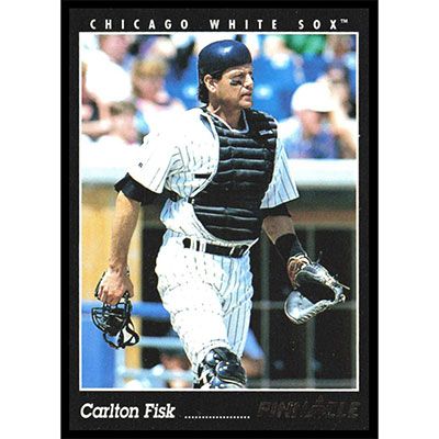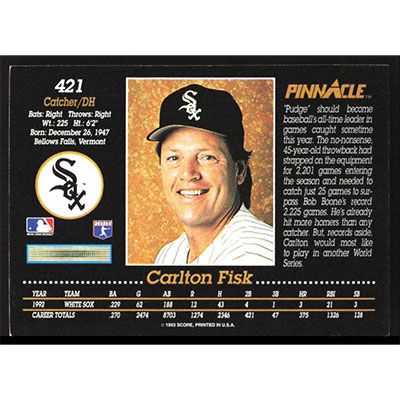 This is a 1993 Pinnacle Carlton Fisk baseball card. The card is #421 and pictures show condition.