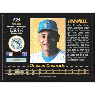 This is a 1993 Pinnacle Orestes Destrade baseball card. The card is #526 and pictures show condition.