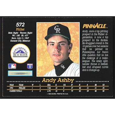 This is a 1993 Pinnacle Andy Ashby baseball card. The card is #572 and pictures show condition.