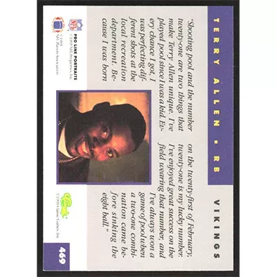 This is a 1993 Pro Line Portraits Terry Allen football card. The card is #469 and pictures show condition.