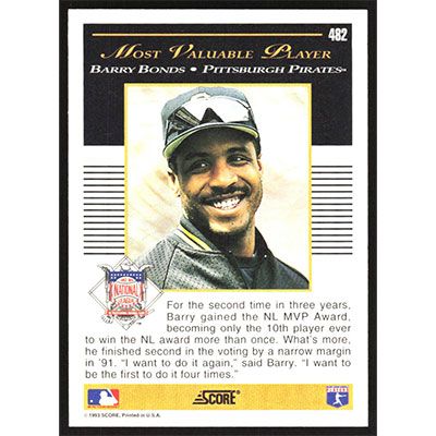 This is a 1993 Score Barry Bonds MVP baseball card. The card is #482 and pictures show condition.