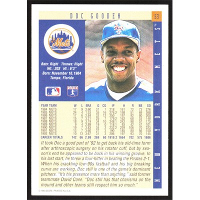 This is a 1993 Score Doc Gooden baseball card. The card is #53 and pictures show condition.