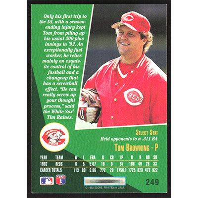 This is a 1993 Select Tom Browning baseball card. The card is #249 and pictures show condition.