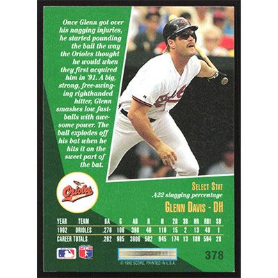 This is a 1993 Select Glenn Davis baseball card. The card is #378 and pictures show condition.