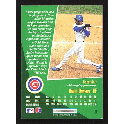 This is a 1993 Select Andre Dawson baseball card. The card is #9 and pictures show condition.