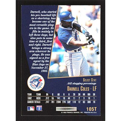 This is a 1993 Select Rookie/Traded Darnell Coles baseball card. The card is #105T and pictures show condition.