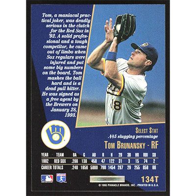 This is a 1993 Select Rookie/Traded Tom Brunansky baseball card. The card is #134T and pictures show condition.