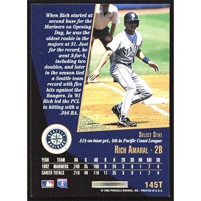 This is a 1993 Select Rookie/Traded Rich Amaral baseball card. The card is #145T and pictures show condition.