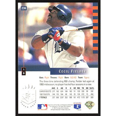 This is a 1993 SP Cecil Fielder baseball card. The card is #236 and pictures show condition.