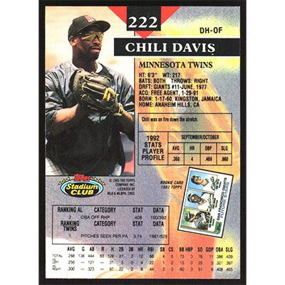 This is a 1993 Stadium Club Chili Davis baseball card. The card is #222 and pictures show condition.