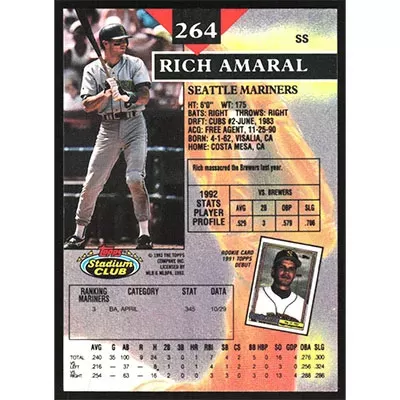 This is a 1993 Stadium Club Rich Amaral baseball card. The card is #264 and pictures show condition.