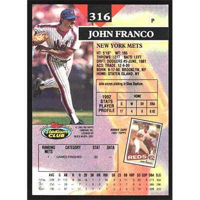 This is a 1993 Stadium Club John Franco baseball card. The card is #316 and pictures show condition.
