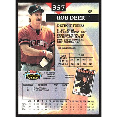 This is a 1993 Stadium Club Rob Deer baseball card. The card is #357 and pictures show condition.